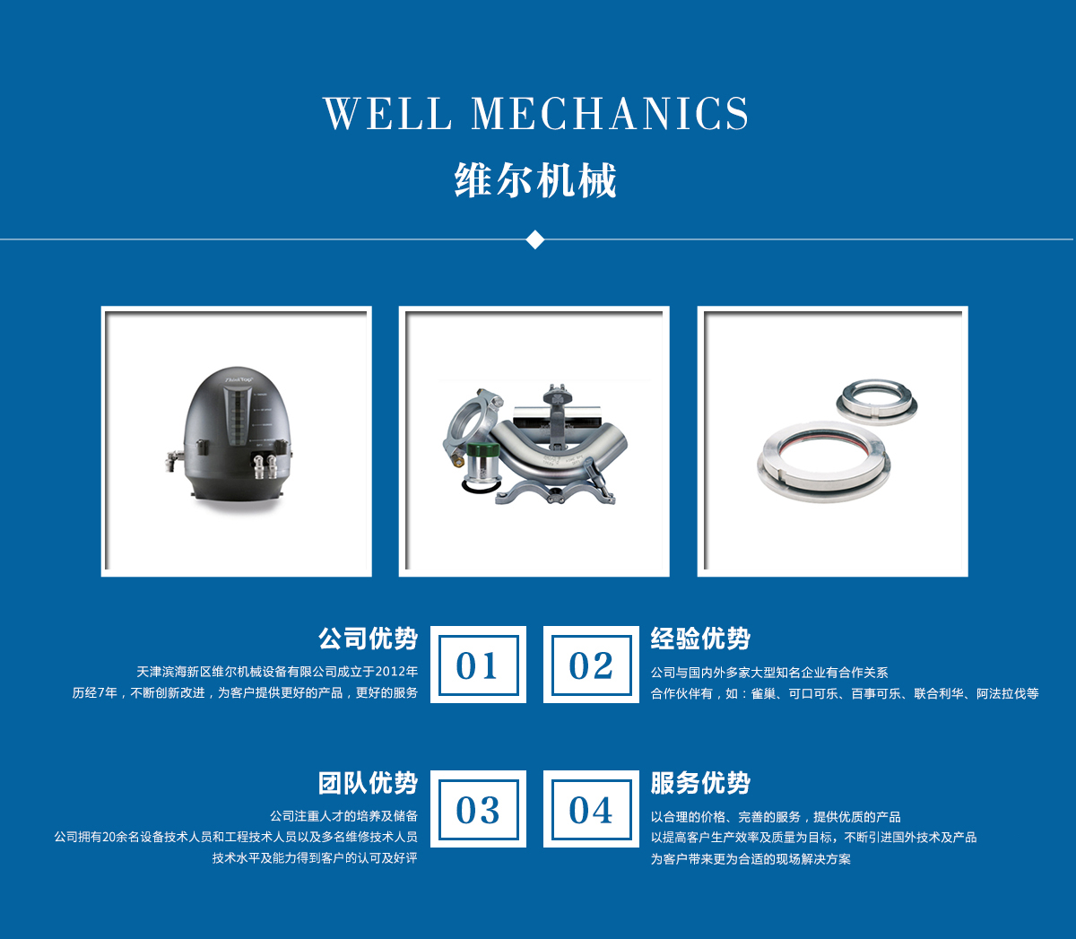 天津?yàn)I海新區(qū)維爾機(jī)械設(shè)備有限公司成立于2012年,注冊(cè)資金1000萬(wàn)元。是一家有限責(zé)任公司,主要面向大眾群體,從事進(jìn)出口設(shè)備及備件的銷(xiāo)售及售后服務(wù),與國(guó)內(nèi)外多家大型企業(yè)有合作關(guān)系,如:雀巢、西得樂(lè)、可口可樂(lè)、百事可樂(lè)、聯(lián)合利華、阿法拉伐、GEA等。公司成立以來(lái)一直秉承現(xiàn)代企業(yè)的科學(xué)管理方法,注重人才的培養(yǎng)及儲(chǔ)備,現(xiàn)公司擁有20余名設(shè)備技術(shù)人員和工程技術(shù)人員以及多名維修技術(shù)人員,技術(shù)水平及能力得到客戶(hù)的認(rèn)可及好評(píng)!不斷提升企業(yè)的競(jìng)爭(zhēng)力,使企業(yè)在發(fā)展中樹(shù)立起良好的社會(huì)形象。憑借良好的水平和成熟的技術(shù)。以科學(xué)的管理手段,良好的技術(shù)力量,將不斷深化改革,創(chuàng)新機(jī)制,適應(yīng)市場(chǎng),發(fā)展。公司客戶(hù)及服務(wù)內(nèi)容:亞實(shí)動(dòng)力、機(jī)械設(shè)備安裝調(diào)試;約翰迪爾設(shè)備安裝及水電氣安裝;凱諾斯、電裝、設(shè)備安裝;GEA公司,飲料無(wú)菌生產(chǎn)線(xiàn)整線(xiàn)的設(shè)備安裝調(diào)試,舊線(xiàn)的大修保養(yǎng);為GEA液體部提供服務(wù)技師,對(duì)無(wú)菌生產(chǎn)線(xiàn)進(jìn)行安裝和調(diào)試。天津聯(lián)合利華工廠(chǎng)...